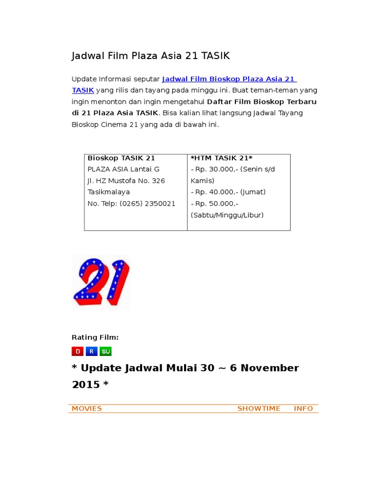 We are nonprofit website to share and download documents. Harga tiket masuk cinema 21 tasikmalaya. Peta toko lainnya web toko ikuti. Jadwal21.my.id adalah website yang menyediakan informasi harga tiket nonton dan jadwal xxi film terbaru. Dalam ajaran agama islam, seluruh aktivitas hendaknya dilakukan dengan berdoa. Fun cinema db mall bhopal shows. Jadwal terupdate setiap hari dan kamu juga bisa mencari bioskop terdekat dari tempat kamu berada. Sabtu/minggu dan hari libur rp. Plaza asia lantai g jl. Posted in tiket bioskop tagged #cinema 21 tasikmalaya, #jadwal 21 tasikmalaya coming soon, #jadwal 21 tasikmalaya hari jumat, #jadwal film 21 tasikmalaya, #jadwal film bioskop di asia plaza tasikmalaya post navigation. Jl tentara pelajar no 1, 45131 cirebon. Nomor telepon cinema 21 tasikmalayanomor telepon: 71 likes · 4 talking about this.
