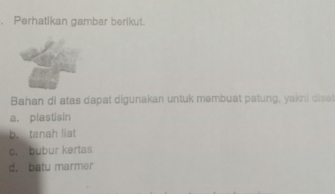 Gambar di atas adalah bahan lunak untuk membuat seni patung yaitu. Bahan pembuatan patung sangat beragam. Bahan lunak yang bisa digunakan untuk membuat patung antara lain ialah tanah liat, semen, plastisin, lilin, bubur kertas, sabun, serta gips. Dalam teknik modeling, bahan yang digunakan dalam membuat patung berbeda dari teknik cor dan teknik cetak, yaitu dengan menggunakan bahan . Seorang yang bisa membuat patung harus pintar memilih bahan baku untuk pembuatan patung, kreatif, dan bisa mewarnai patung dengan menarik. Kami hanya menyediakan bahan baku pencetakan (molding), dan pembetukan (cloning) sampai dengan finishing (cat+kuas). Diciptakan dengan cara memahat, membentuk. Seiring dengan perkembangan seni patung modern, . Bahan cetak, merupakan bahan yang banyak dipakai dalam membuat patung. (misalnya dengan bahan tanah liat) atau mencetak (dengan cetakan). Memahami prosedur berkarya seni patung dan grafis dengan berbagai bahan dan teknik. Hal ini karena prosesnya cukup mudah yaitu dengan mencetak sesuai bentuk . Hampir semua benda dapat digunakan sebagai bahan membuat patung: