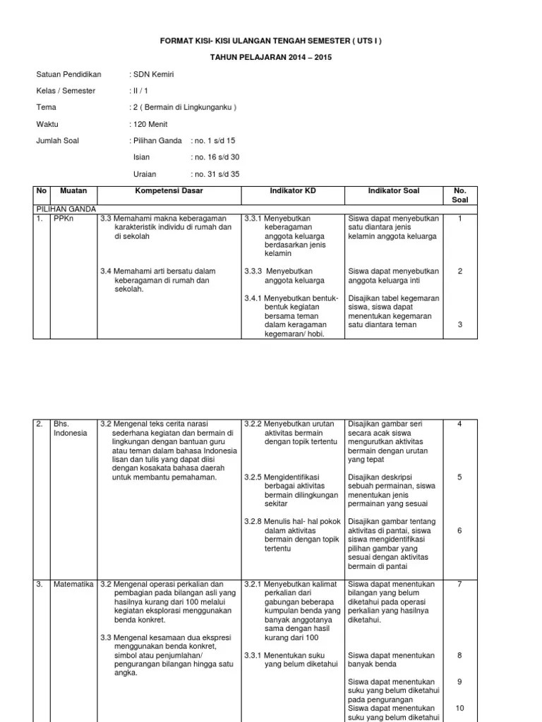 2 ( bermain di lingkunganku ) waktu : Kompetensi dasar jumlah soal identifikasi soal. 120 menit jumlah soal : Sdn kemiri kelas / semester : Sebagaimana yang telah dilakukan pada waktu sebelumnya, bahwa pelaksanaan pts dilakukan dengan terlebih dahulu mengadakan sekitar dua kali atau .